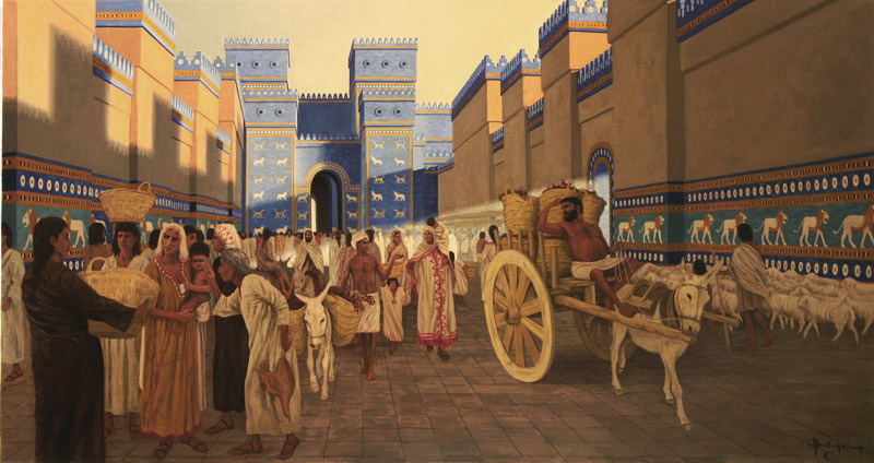 Nabucodonosor II (sí, el de los jardines) ordenó construirlas, estando formadas por numerosos ladrillos vidriados, la mayoría de color azul (lo que la hacía contrastar fuertemente con todos los edificios de su alrededor), mientras que otros son dorados o rojizos. Éstos últimos se disponen dibujando la silueta de dragones, toros, leones y seres mitológicos. La parte inferior y el arco de la puerta están decoradas por filas de grandes flores semejantes a margaritas. La Puerta de Istar contaba originalmente con dos esfinges dentro del arco de la puerta, que se han perdido hoy en día.